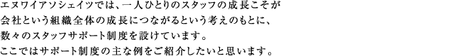 エヌワイアソシェイツでは、「コピーライター」「デザイナー」「進行管理」の各グループ中で、さらに複数のチーム分けがされています。チームはリーダー・サブリーダーを中心に数名のスタッフで構成され、プロジェクトに対して基本的にチーム単位で担当します。新人スタッフの教育も各チーム内でそれぞれ実施し、先輩スタッフによるきめ細かい指導が行なわれています。